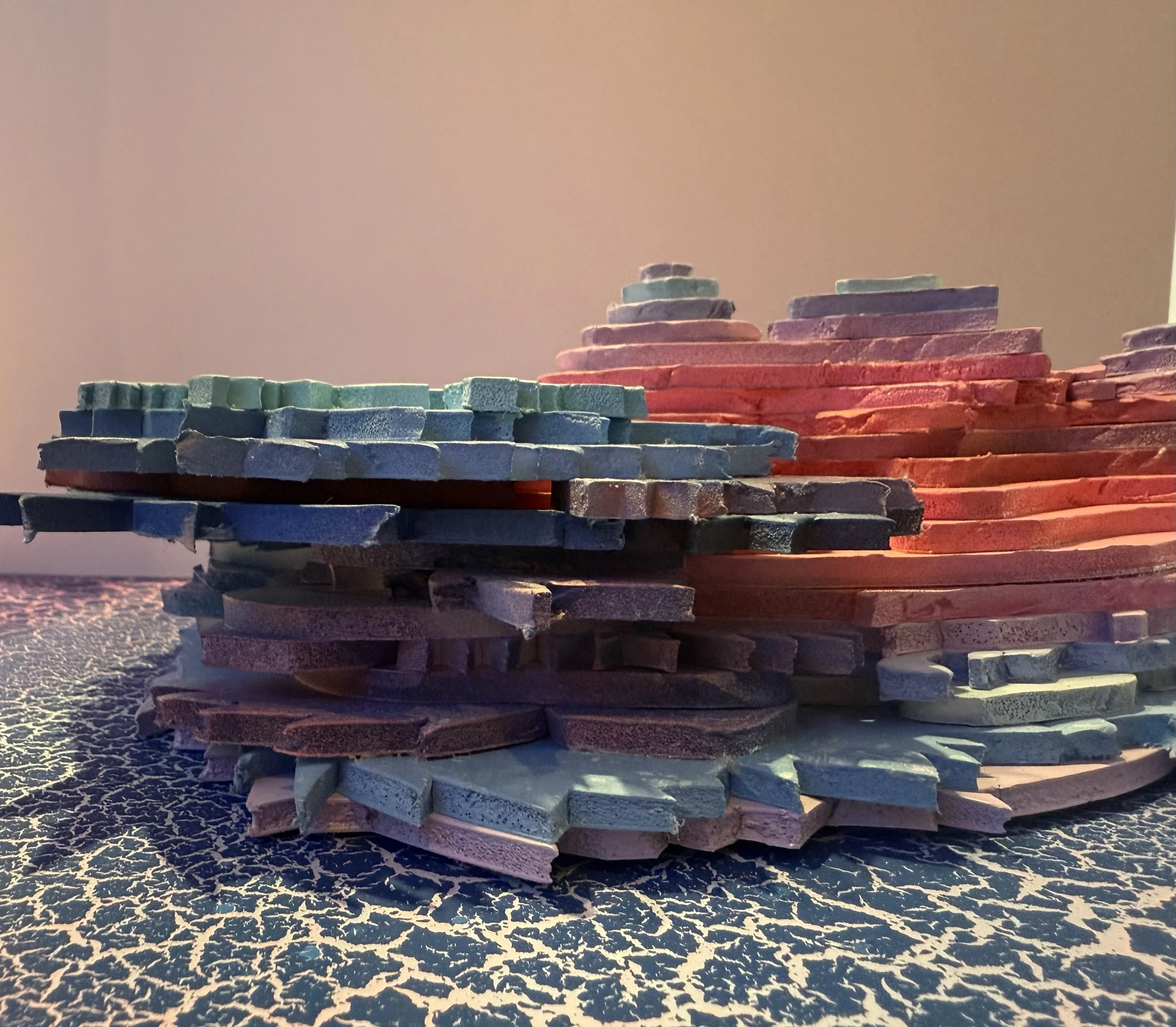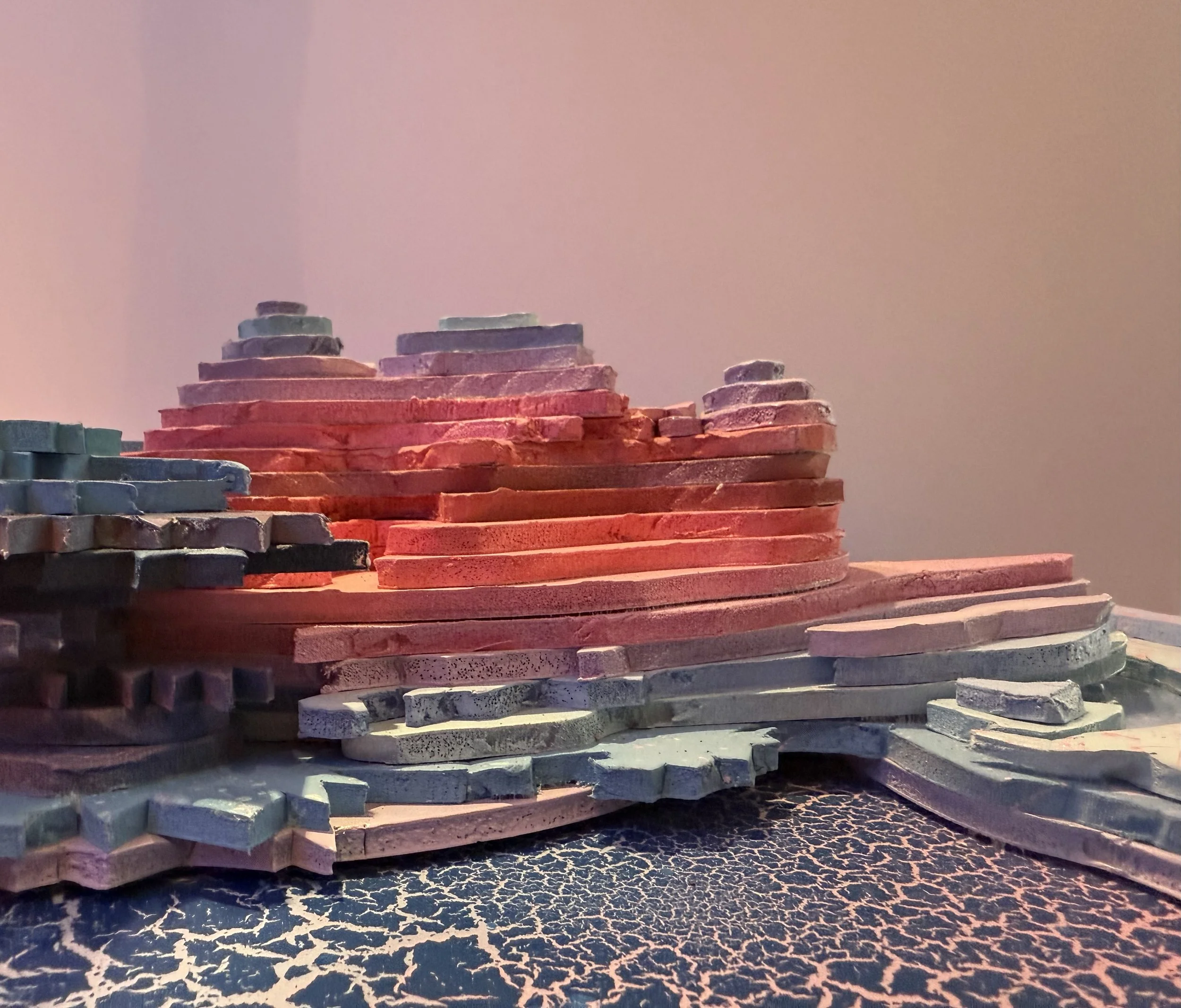Inspired by the layers of sentiments in the Grand Canyon landscape, I created a topographic self-portrait that highlights the ombré of my favorite colors, pinks and blues. I want the finished structure to capture the rigid waves of the landscape.